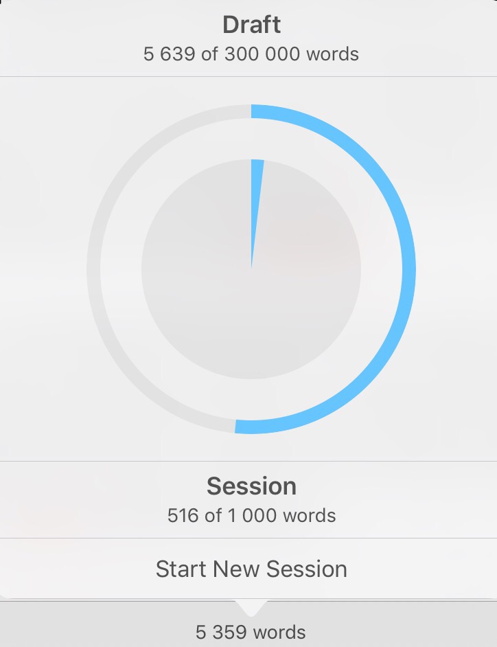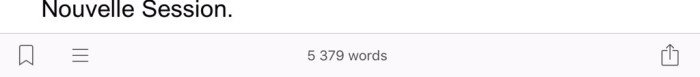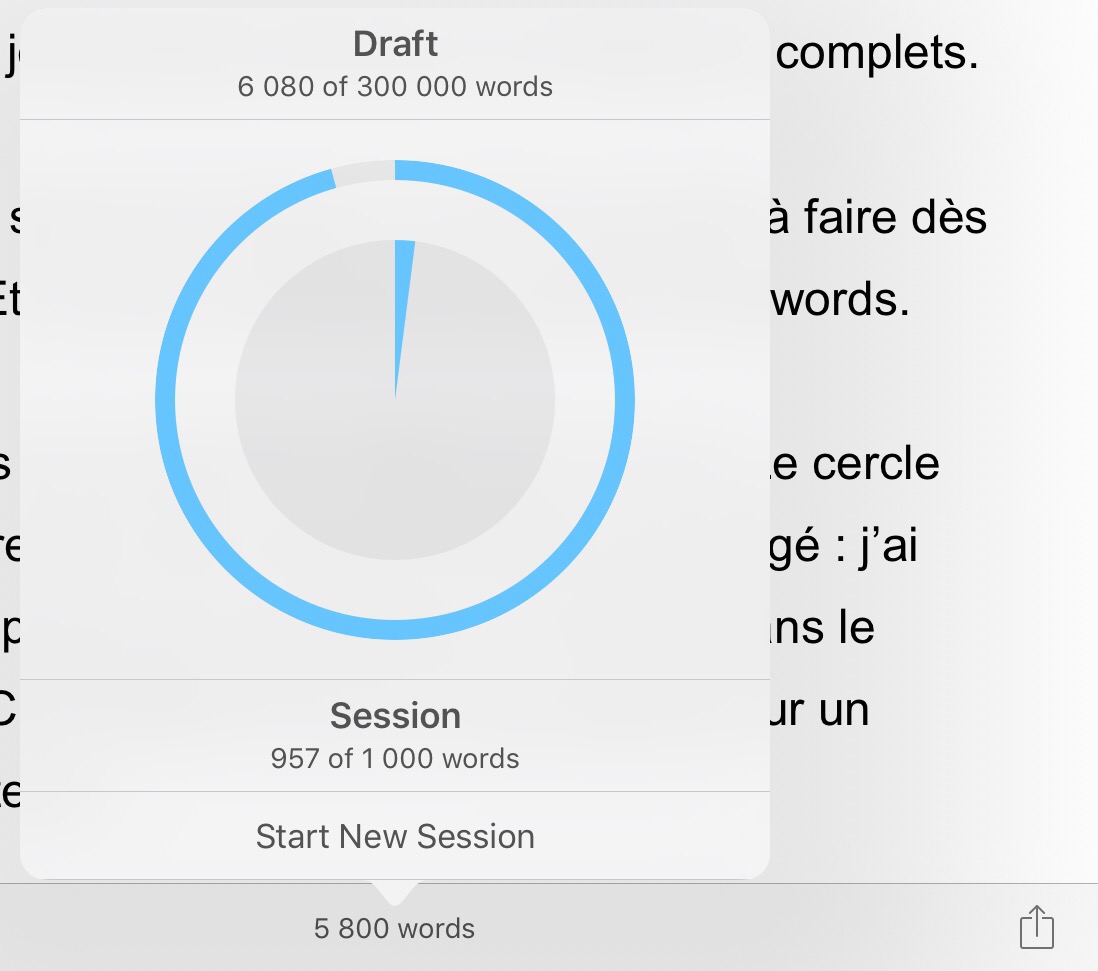 Pour savoir la production du jour, il faut mettre la page en cours d’écriture sur Done, haut de page à droite, la synchroniser avec Dropbox en bas de page à droite encore, toucher le nombre de mots au milieu en bas et sélectionner : Start New Session.