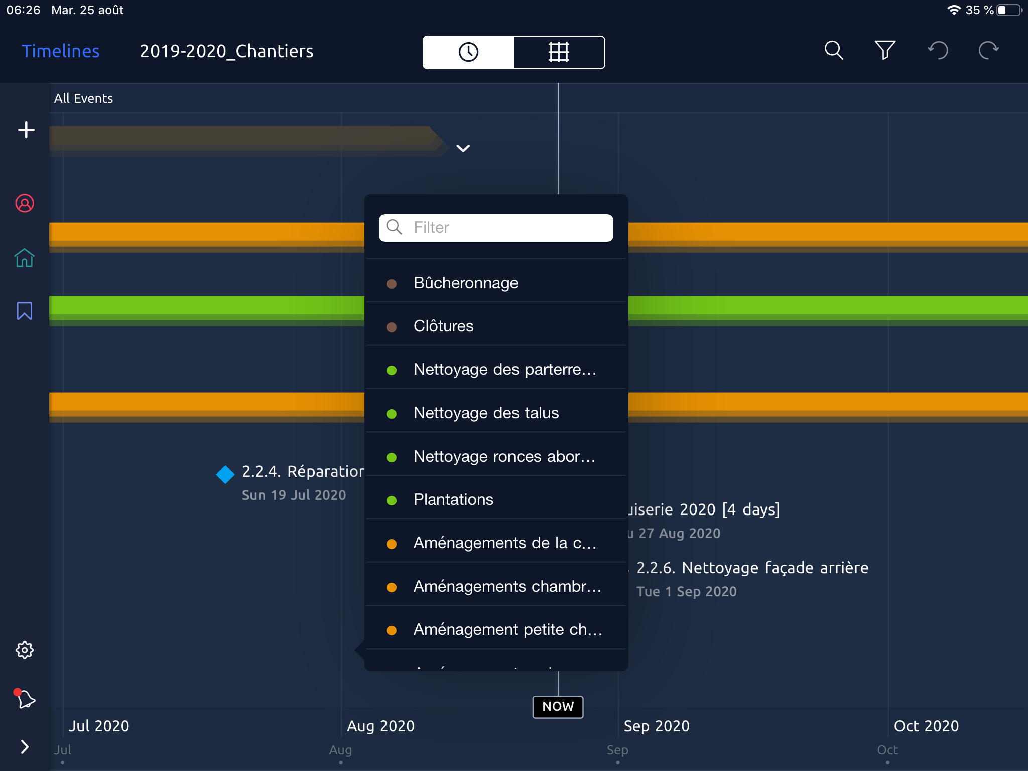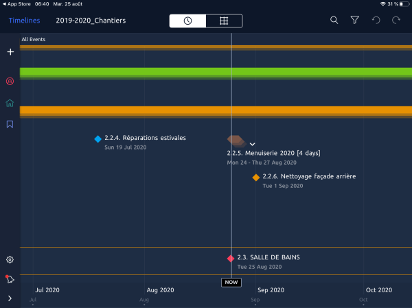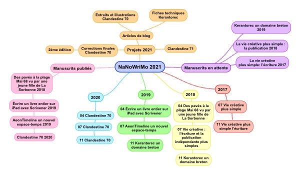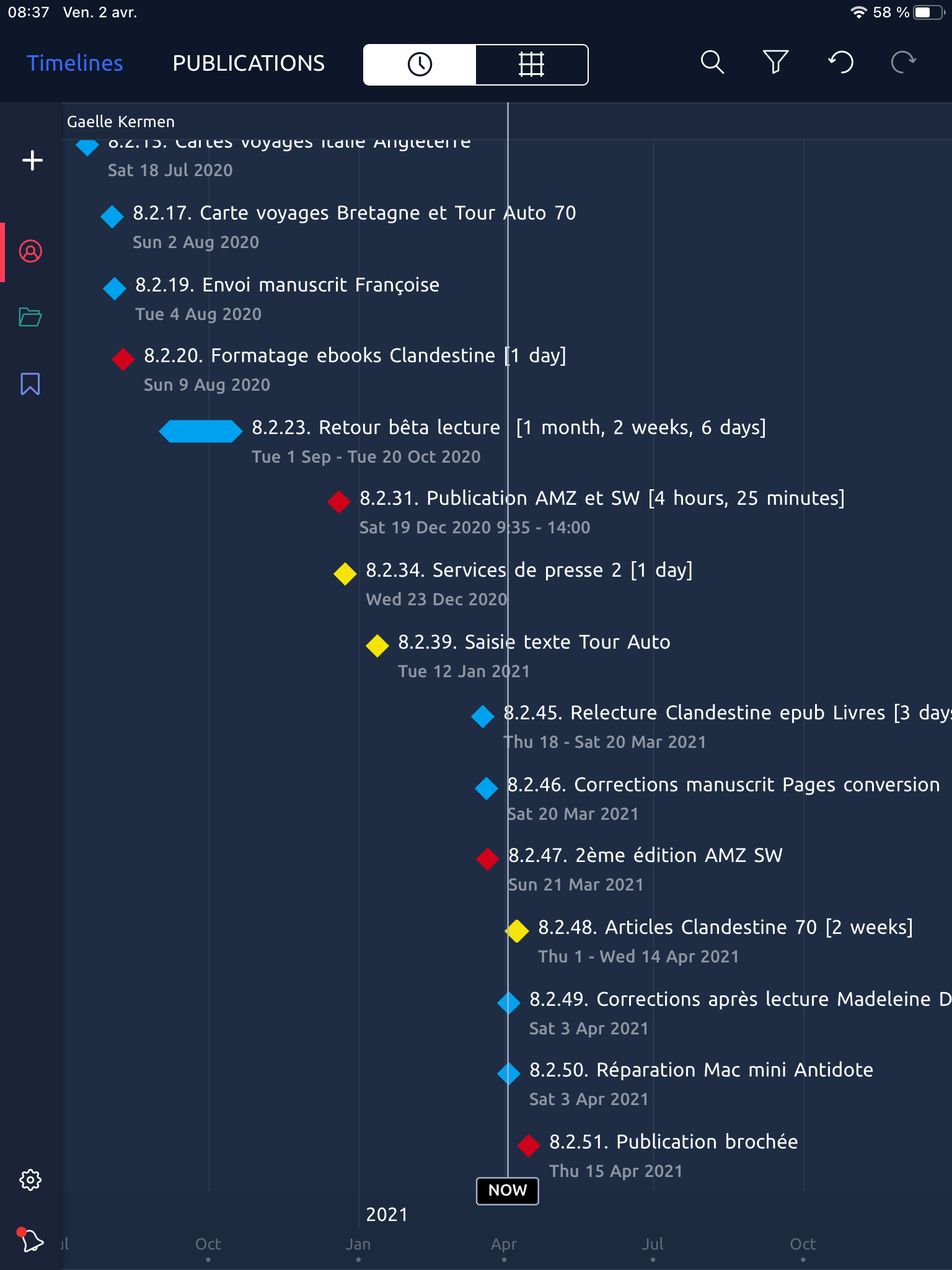 Je suivais mes publications dans un projet AeonTimeline sur mon iPad ou iPhone. Ce qui est estompé est déjà fait. Ce qui est en noir est encore à faire.