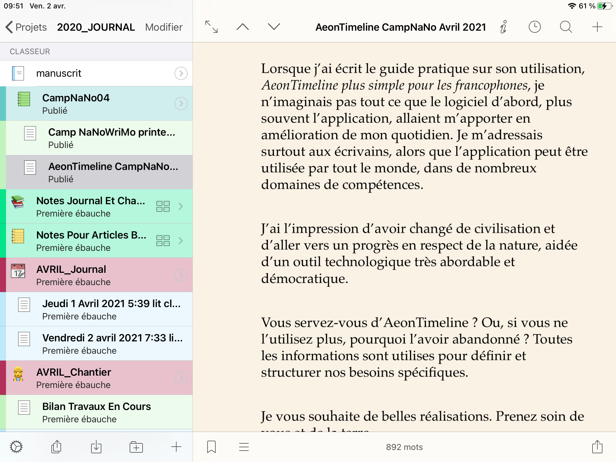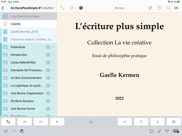 J’ai désormais une bonne expérience d’écriture et de publication. Je travaille dans d’excellentes conditions, j’ai acquis une bonne organisation et une bonne connaissance de la technique. Je vous transmets les manipulations principales que j’utilise moi-même pour faire mes livres. Appropriez-vous les fonctions de Scrivener iOS, adaptez-les à vos besoins pour vous concentrer sur l’essentiel : l’écriture et la publication.