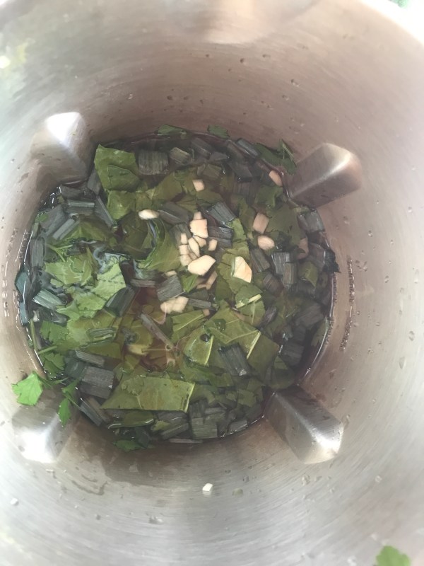 Ici, j’ai mis des feuilles de jeunes poireaux, des fanes de betteraves sorties du congélateur, de l’ail, de l’oignon…