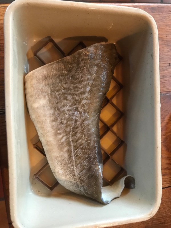 J’avais mis à dessaler les deux morceaux de morue séchée au sel sur une grille, pour que le sel tombe au fond du plat en terre.