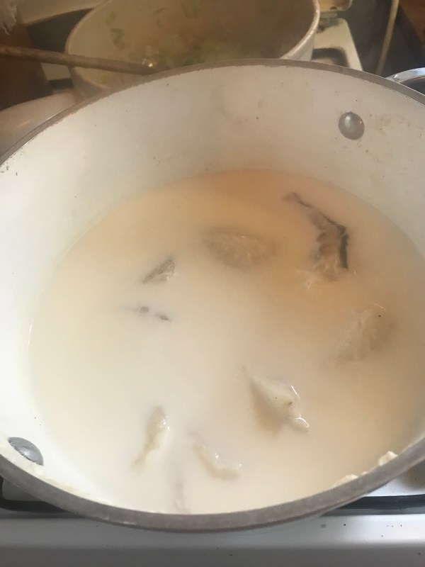 Pourtant, j’ai dû faire dessaler un jour de plus tant je trouvais la chair encore salée à la fin des 24 heures. Je n’ai pas utilisé le lait de cuisson pour ne pas ressaler le plat, ayant de mauvais souvenirs de morue trop salée. J’ai utilisé ce lait pour la pâtée des poules.