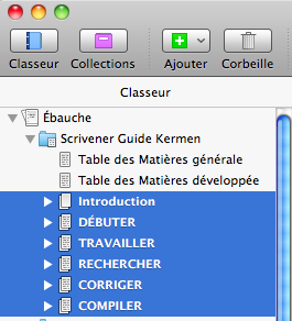 Sélection des dossiers des parties avec le raccourci [Maj+clic+C] Ou Modifier -> Sélectionner avec les sous-dossiers, tout est sélectionné ou [alt+cmd+A] Modifier −> Copy Special -> Copier les documents comme TdM Table des Matières -> Coller et appliquer le style Compiler en PDF