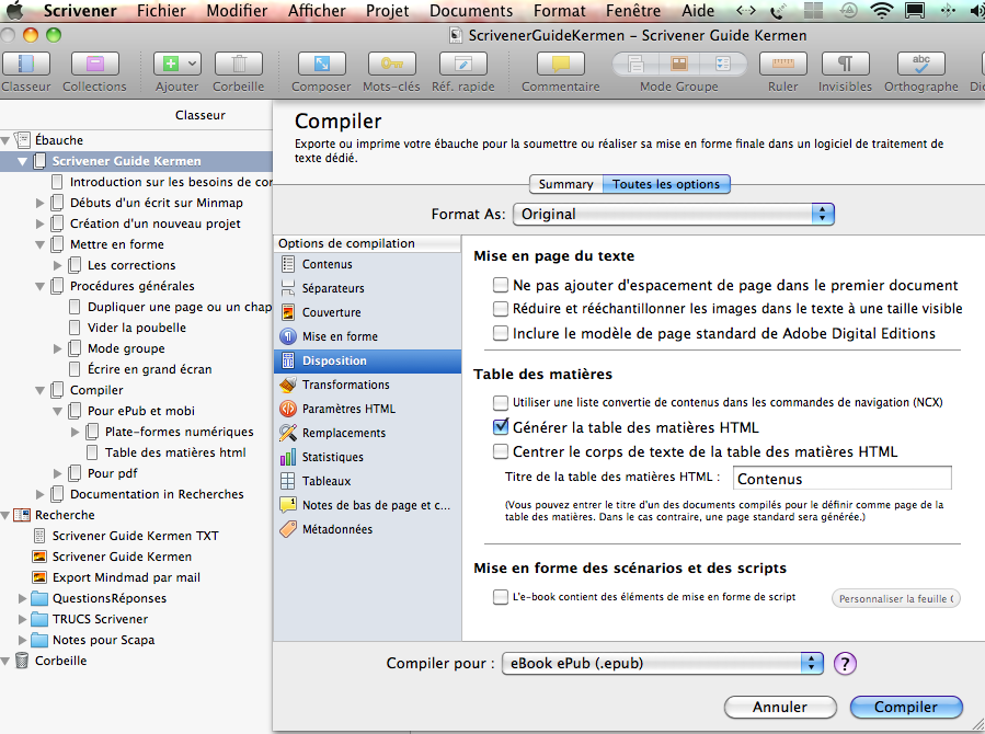 Créer une table des matières sur Scrivener pour un fichier PDF imprimable
