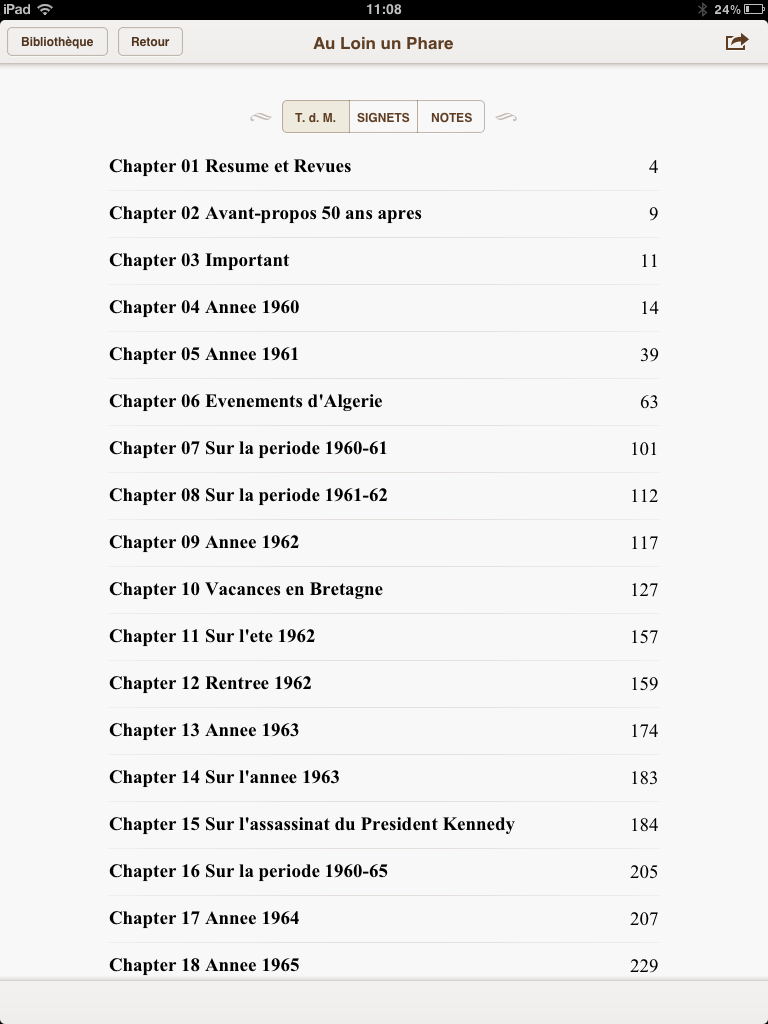 J’utilise ici la table des matières du premier Cahier 1960-65, que j’ai publié en janvier 2010. À l’époque, il fallait créer des chapitres en anglais pour se repérer. Depuis, les procédures se sont simplifiées, je suis heureuse de vous faire profiter de mon expérience. J’espère vous éviter de galérer autant que moi à la préhistoire de l’édition numérique.
