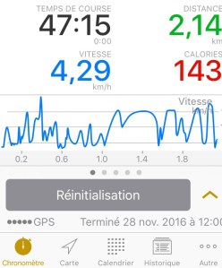Je ne sais pas combien de mètres j’ai fait dans ces allers et retours et je vais mesurer aujourd’hui avec Cyclometer, l’application qui me sert à mesurer mes courses à vélo.