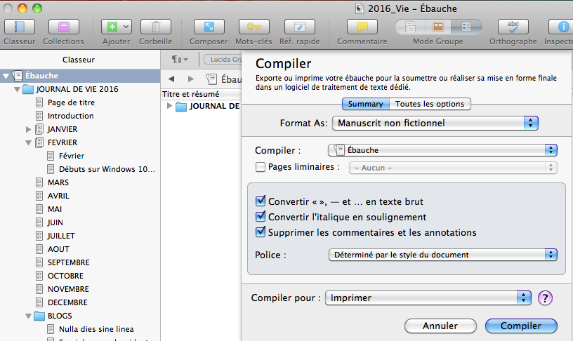 La publication est le but final de votre écriture, en ebook comme sur papier. Sur Scrivener, ça s’appelle la Compilation. Elle se pense dès le début de votre travail, mais vous pouvez toujours tout changer jusqu’au moment de cliquer sur Compiler.