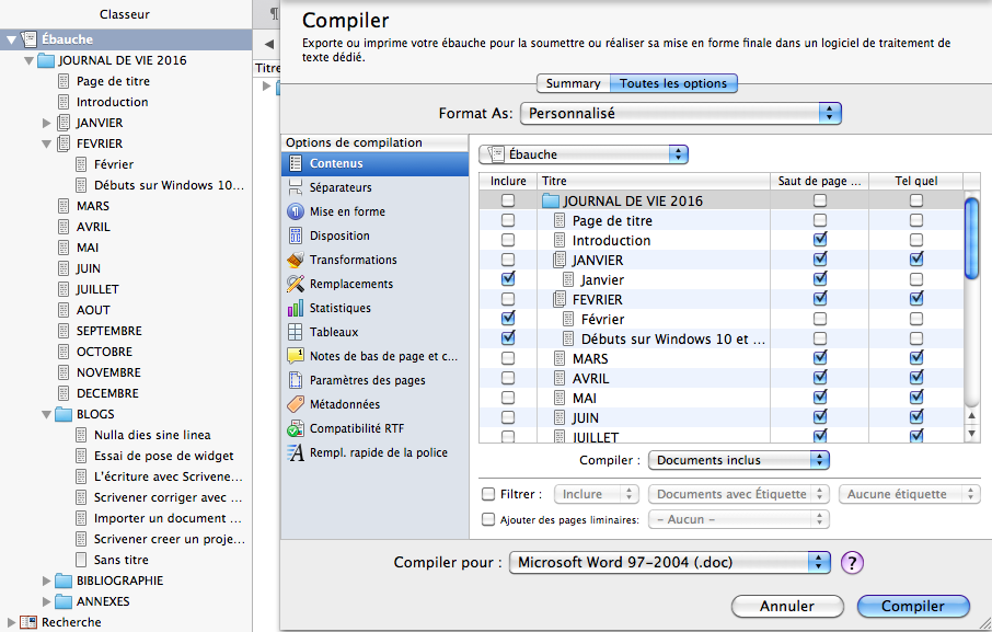 Ici c’est Compiler pour : Microsoft Word 97-2004, pour obtenir un document .doc, format parfait pour la publication sur la plateforme numérique de Smashwords ou celle de Draft2Digital. Pour Amazon, préférez le format .mobi.
