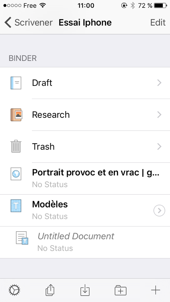J’ai d’abord testé les outils compatibles avec l’application en restant sur les outils mobiles, sans utiliser le logiciel de bureau Scrivener.